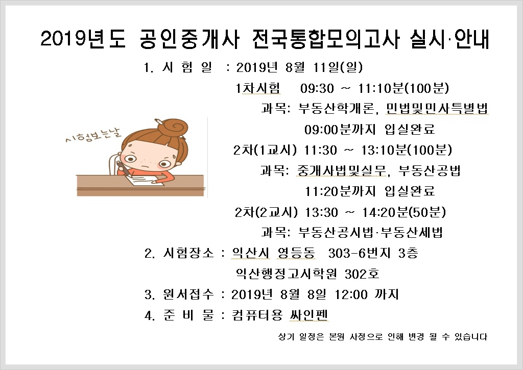 19.08월 공인중개사 전국통합 모의고사 실시 안내 작성자익산행정고시학원|작성시간19.08.05|조회수66 목록 댓글 0 글자크기 작게가 글자크기 크게가 다음검색 현재 게시글 추가 기능 열기 북마크 공유하기 신고 센터로 신고 댓글 댓글 0 댓글쓰기 답글쓰기 댓글 리스트