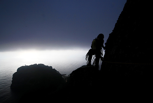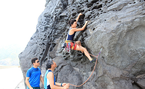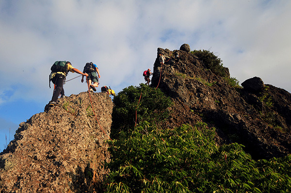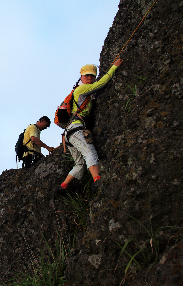 바위가 나와도 모두들 그냥 올라간다. 선두로 가는 상세에게 그래도 취재인데 안전을 위해 로프를 깔고 가자고 했는데 동행하는 사람들이 로프를 대부분 건들지 않고 간다. 그만큼 경사나 안전을 위해 로프를 쓸 정도의 난이도가 아닌 것이다. 두 번째 피치를 오를 때에는 올라가는 난이도보다는 실수로 낙상을 하면 좌우의 절벽으로 떨어질 수가 있어 모두 통과하고 지나간다. 해풍에 의해 울퉁불퉁하게 변해버린 바위는 깨지기 쉽게 변형되어 있어 작은 홀드를 잡으면 깨어지거나 밟고 오를 때 잘 부서진다.
