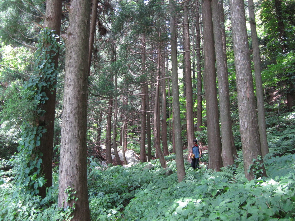 왼쪽에 보이는 가건물 뒤편으로 작은 오솔길이 삼나무 사이로 나있습니다.