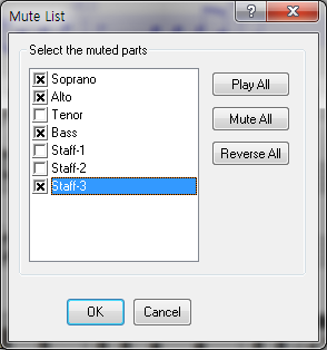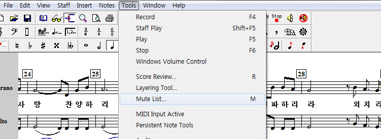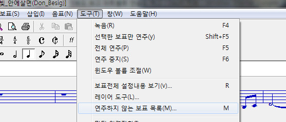 * 한글 버전에서는 '도구' 메뉴에서 '연주하지 않는 보표목록' 을 선택하시면 됩니다.