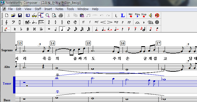 아래 예제는 Tenor파트와 피아노 반주만을 듣도록 선택한 것입니다.