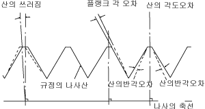 | 제품의 나사산의 각도와 규정상의 나사산의 각도와의 차를 말하며, 규정의 각도보다 큰 것을 정, 작은것을 부, 반각의 오차를 둘 더한 것이다. 플랭크 오차: 실제 플랭크각과 규정의 플랭크각의 차 산의 반각의 오차: 나사산의 중심원에서 대칭한 산형일 때의 플랭크각의 오차 ![]() | |||||||||||||||||||||||||||||||||||||||||||||||||||||||||