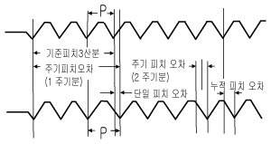 | 제품의 실제의 피치 오차와 규정상의 피치의 차를 말하며 규정보다 클 경우를 정, 작은 경우를 부로 한다. 일반적으로는 1 피치에 대해서 말한다, 그 피치 이상에 대해서 말하기도 한다. 단일피치오차 : 1피치에 대한 피치의 오차 누적피치오차 : 2피치 이상 떨어진 피치의 합계의 피치 오차 절진피치오차 : 단일피치 오차가 정 또는 부가 되는 피치 오차 주기피치오차 : 단일피치 오차가 주기적으로 증감되는 피치 오차 ![]() | |||||||||||||||||||||||||||||||||||||||||||||||||||||||||