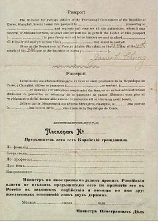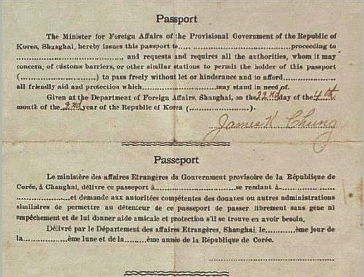 상해임시정부에서 발행한 여권이 남아있는 유일한 주인공이다.