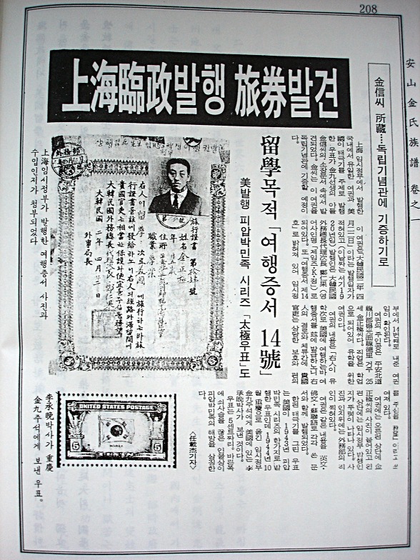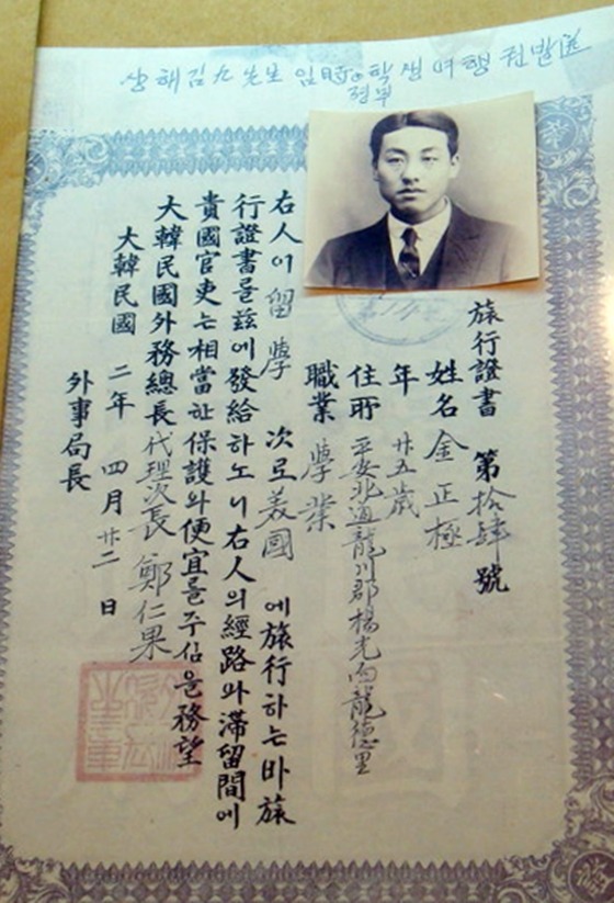 김정극(金正極)이 학업차 미국으로 여행 할 때 사용한 임시정부에서 발행한 여권이다.