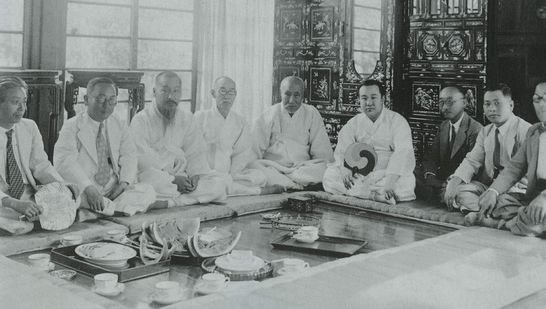 왼쪽부터 청천 이상범, 월탄 박종화, 춘곡 고희동, 석정 안종원, 위창 오세창, 간송, 박종목,
