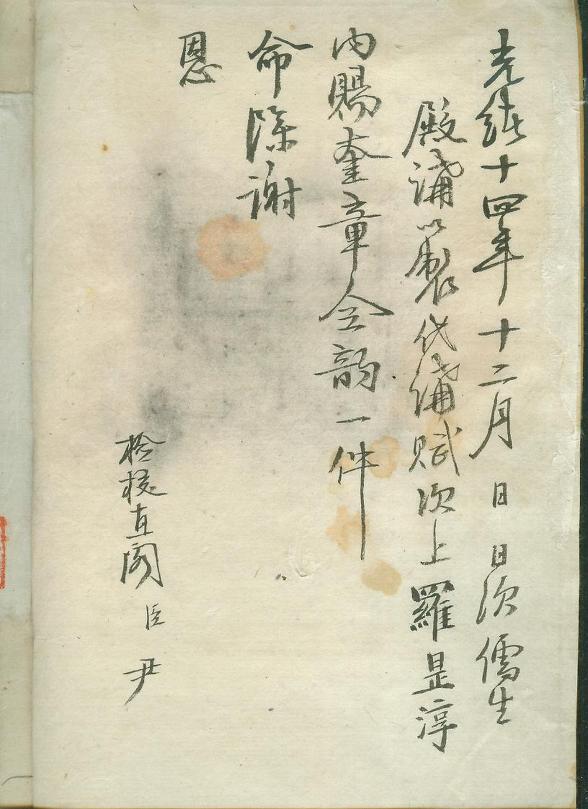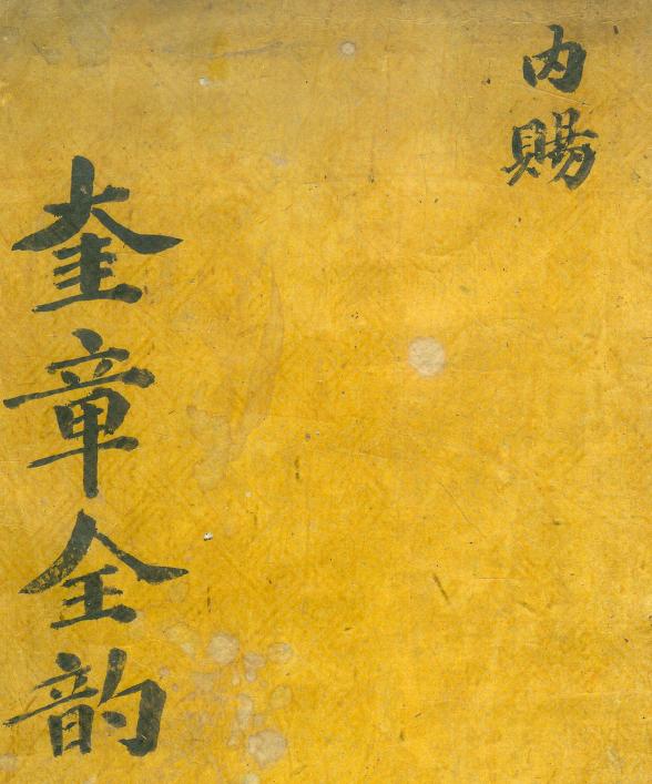 시 백일장에서 2등을 한 유생 나정순에게 규장전운 1건을 내리라는 고종임금의 명령이 있자, 이 명령을 받든 규장각 응교직윤 신하 윤모씨가 이 책 속 표지에 이 책을 내리게 된 경위와 고종의 명령을 써서 내렸습니다.