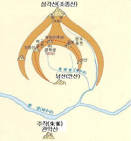 멀리 우뚝 솟은 종산(宗山)에서 발원하는 기(氣)가 땅속으로 흘러 흘러 산줄기의 흐름을 타고 산 아래 낮은 곳으로 내려온다.