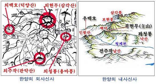 그들은 방위(方位)를 청룡(靑龍:東) ·주작(朱雀:南) ·백호(白虎:西) ·현무(玄武:北)의 4가지로 나누어 모든 산천(山川) ·당우(堂宇)는 이들 4개의 동물을 상징하는 것으로 간주하였고, 어느 것을 주로 하는가는 그 장소나 풍수에 따라 다르게 된다.