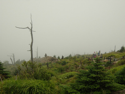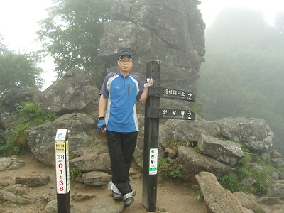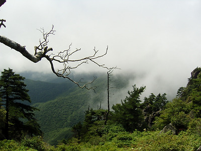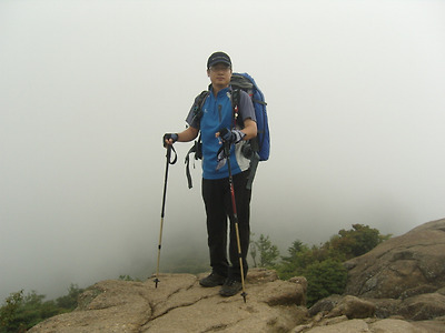 안개가 짙게 깔렸지만 다행히 비는 내리지 않는다. 어제 사귀었던 이와 아침을 해 먹고 짐을 꾸려 8시에 세석을 출발하였다. 장터목까지 3시간, 천왕봉까지 1시간이면 넉넉하리라 보고 쉬엄쉬엄 걷기로 하였다. 장터목이 아니면 점심 먹을 때가 없어 라면을 끓여 먹을까 하다가 그냥 행동식으로 대신하고 생각해보니 천왕봉에서 치밭목 대피소 거쳐 대원사까지 6시간은 잡아야 하겠다. 그럼 대원사에 저녁 7시에 도착. 이건 너무 늦다. 또 도로를 2Km 걸어 내려가 진주행 버스를 타야 하는데 그 시간에 진주를 간들 고속버스가 없을 것이다. 치밭목에서 1박을 더 할까 망설이다가, 체력이 소진된 것을 감안하면 무리한 일정인 것같아 계획을 변경한다. 일단 천왕봉을 오르고 장터목으로 빽해서 백무동으로 내려가기로 정했다.
