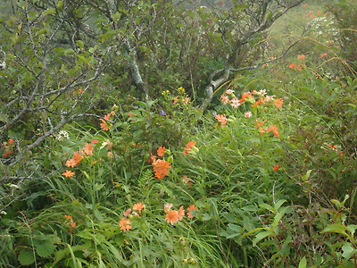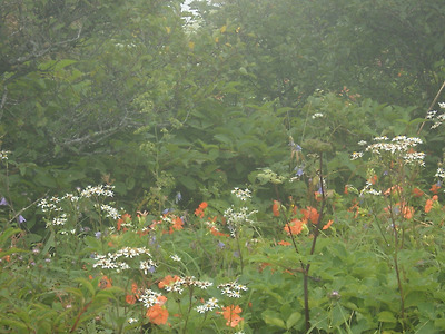 동자꽃과 흰색의 취나물꽃이 잘 어울려 있습니다. 보라색 꽃은 금강초롱 같기는 한데 확실하지는 않습니다.
