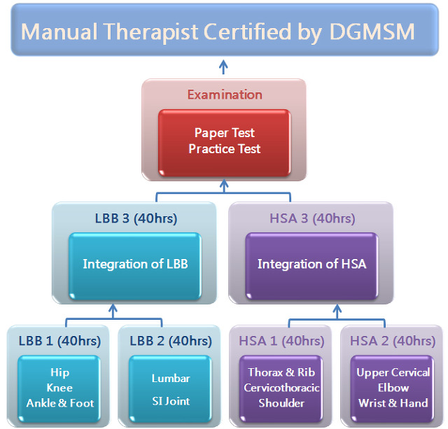 독일에서는 물리치료과를 졸업하여 국가시험에 합격하면 물리치료사가 되는 것은 우리나라와 같은데, 그 후 도수치료에 관심이 있는 치료사들은 여러 학회 교육프로그램의 이수 후 이론과 실기시험을 통해 Manual Therapist가 됩니다. 그 중에서 DGMSM이 가장 공신력이 있으며, 독일 뿐만 아니라 많은 유럽국가에서 공인되는 교육입니다.