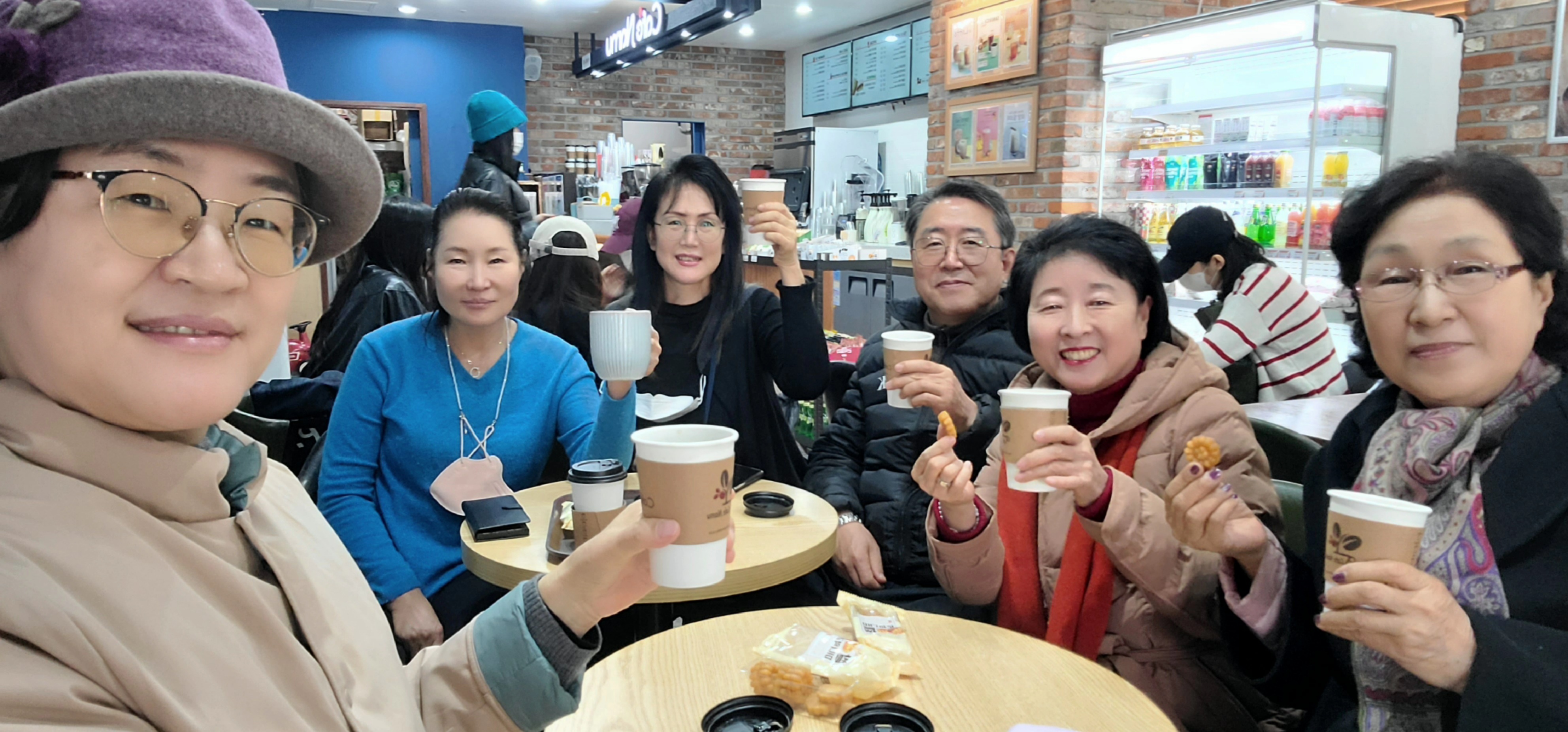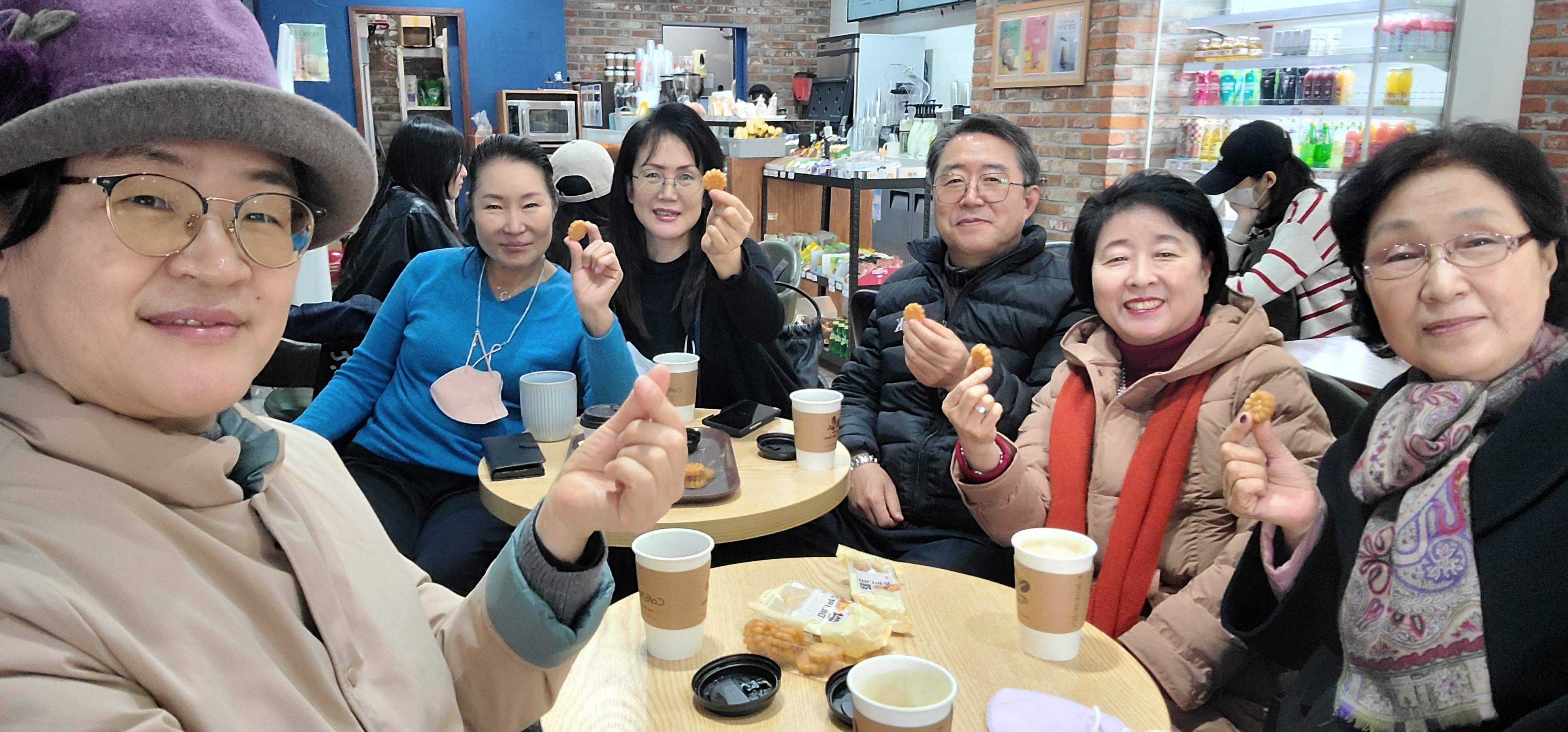 점심과 커피를 제공하신 희수님, 따뜻한 호두과자를 맛보이신 회장님, 카페에서 미니약과를 꺼내오신 성덕님