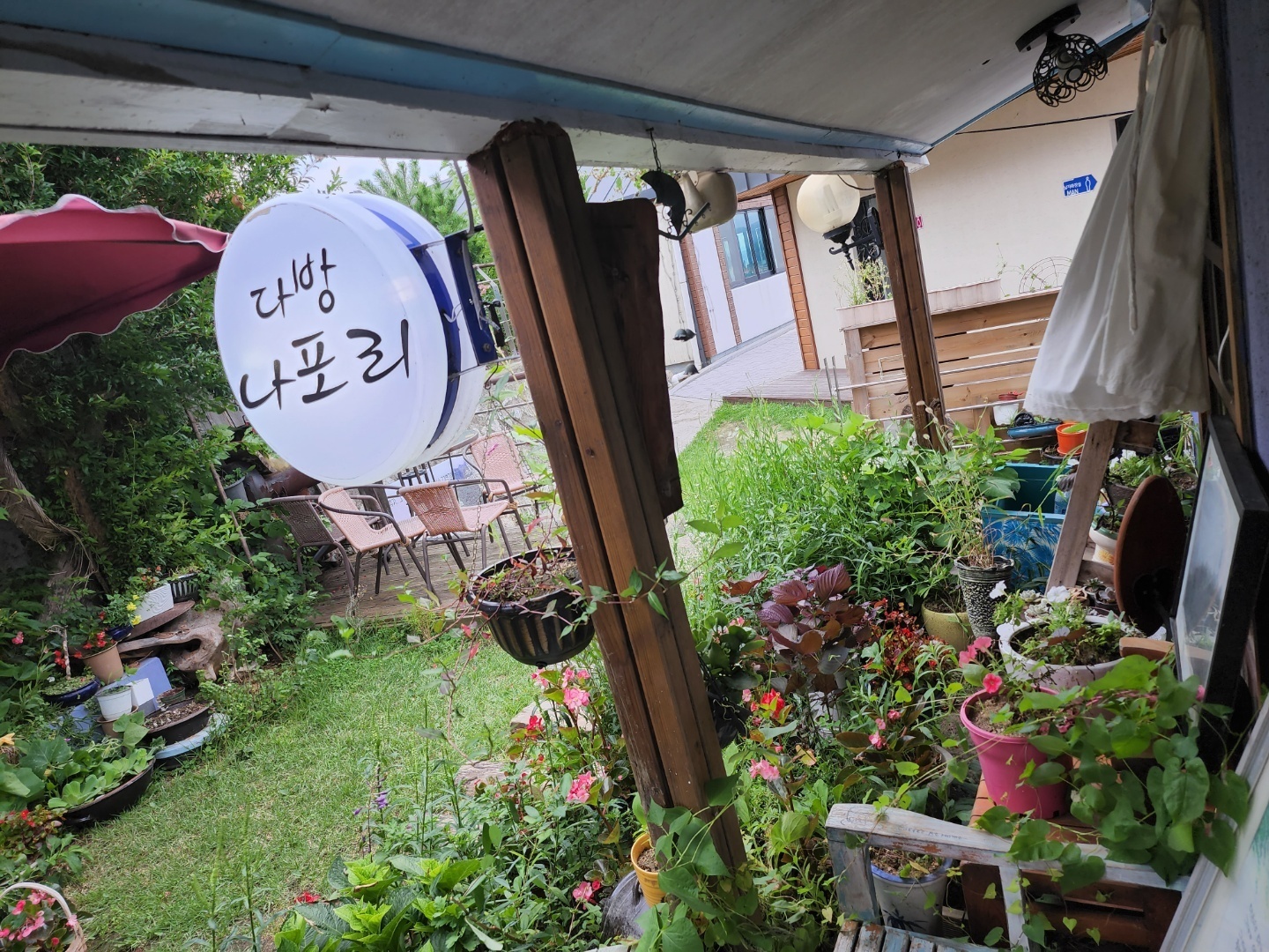 넓은 마당엔 잔디가 깔려있는데 자그마한 장식이 구석을 빛내고 있다.