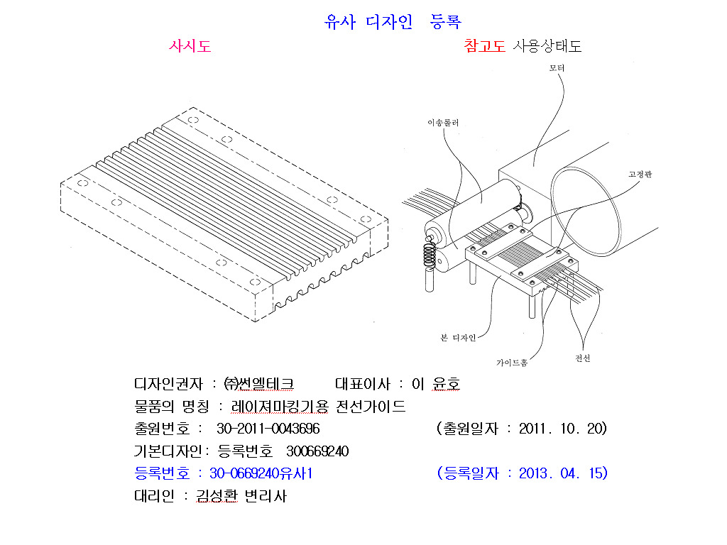 디자인권자 : ㈜썬엘테크, 대표이사 : 이 윤호, 물품의 명칭 : 레이져마킹기용 전선가이드, 등록번호 : 30-0669240유사1 작성자김성환 변리사|작성시간13.04.19|조회수85 목록 댓글 0 글자크기 작게가 글자크기 크게가 다음검색 현재 게시글 추가 기능 열기 북마크 공유하기 신고 센터로 신고 댓글 댓글 0 댓글쓰기 댓글 리스트