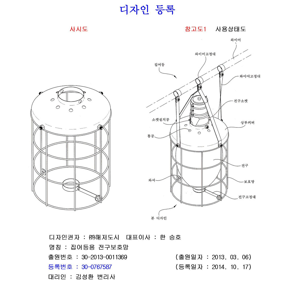 디자인권자 : ㈜해저도시 대표이사 : 한 승호, 명칭 : 집어등용 전구보호망, 등록번호 : 30-0767587. 작성자김성환 변리사|작성시간14.11.06|조회수100 목록 댓글 0 글자크기 작게가 글자크기 크게가 다음검색 현재 게시글 추가 기능 열기 북마크 공유하기 신고 센터로 신고 댓글 댓글 0 댓글쓰기 댓글 리스트
