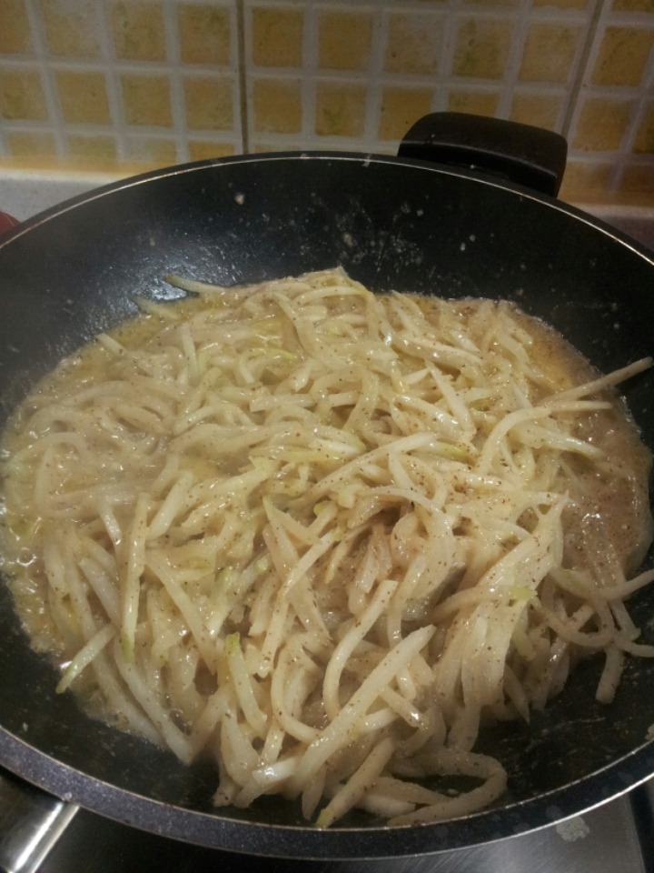2. 오목한팬에 들기름 4T. 넣고 소금에 절인 무 다진마늘1T. 넣고 2분 달달 볶아준후