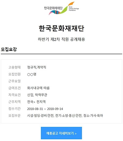 [구인][공기업 한국문화재재단] 전기설비 정규직 5급 하반기 공개채용 (~09/14) 작성자킴찌짱|작성시간18.09.04|조회수10 목록 댓글 0 글자크기 작게가 글자크기 크게가 더 자세한 정보 및 지원하기 http://joburl.kr/NRc4R 다음검색 현재 게시글 추가 기능 열기 북마크 공유하기 신고 센터로 신고 댓글 댓글 0 댓글쓰기 답글쓰기 댓글 리스트