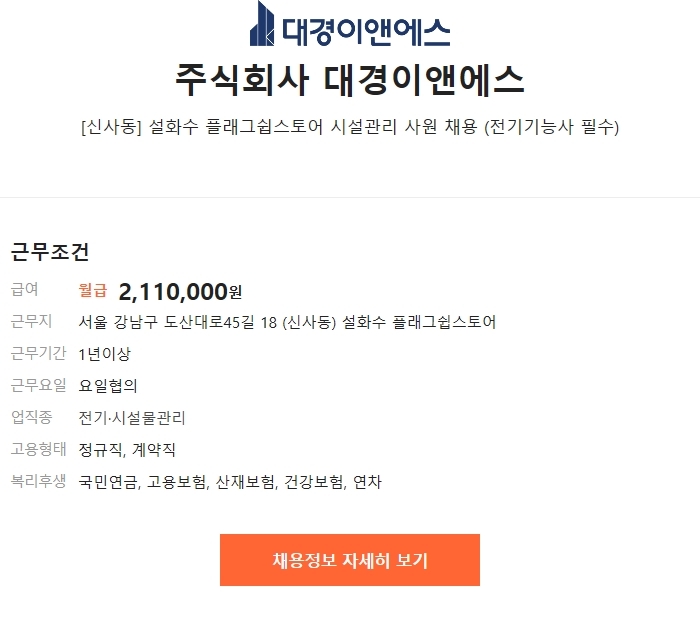 신사동 설화수 플래그쉽스토어 시설관리(전기기능사) 사원 채용 (~02/21) 작성자킴찌짱|작성시간23.02.01|조회수27 목록 댓글 0 글자크기 작게가 글자크기 크게가 신사동 설화수 플래그쉽스토어 시설관리(전기기능사) 사원 채용 (~02/21) 공고 자세히보기 >> http://joburl.kr/xsdQQ ▼ LG CNS 협력사 온라인 채용관 ▼http://joburl.kr/LZlZk 다음검색 현재 게시글 추가 기능 열기 북마크 공유하기 신고 센터로 신고 댓글 댓글 0 댓글쓰기 답글쓰기 댓글 리스트