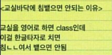 게시물에는 교실 바닥에 침을 뱉지 말아야 할 이유를 영어 단어 'Class'에서 찾으라는 내용이 담겨있다. 교실을 영어로 하면 'Class'인데, 이 단어를 한글타자로 입력하면 '침ㄴㄴ'가 된다는 것. 'ㄴㄴ'은 '노노(No No)'를 가리키는 인터넷 줄임말이다.