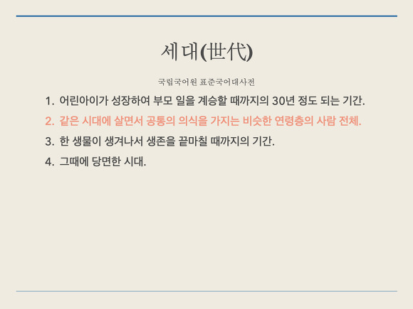 - 세대를 국립국어원 표준국어대사전에 검색해봤습니다. 그중 같은 시대에 살면서 공통의 의식을 가지는 비슷한 연령층의 사람 전체에 조금 더 집중하여 이야기를 풀어가 봅니다.