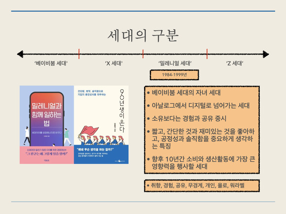 - 작년, 문재인 대통령이 청와대 직원들에게 '90년생이 온다'라는 책을 선물하면서 이슈가 되었습니다. 그리고 올해 초 '밀레니얼'을 키워드로 한 다양한 책들이 베스트셀러가 되며 새로운 세대에 대한 관심이 증가했습니다.