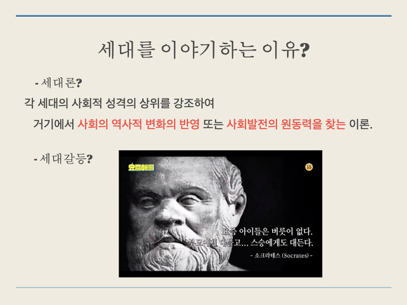 - 세대갈등을 해결하기 위해? 서로를 이해하는데 도움이 되겠지만 근본적인 해결이 가능할까요? 소크라테스도 해결하지 못한...