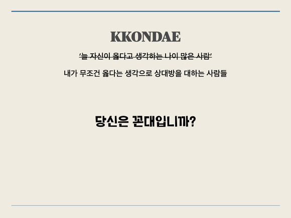 - 꼰대라는 의미를 '내가 무조건 옳다는 생각으로 상대방을 대하는 사람들'이라고 바꾸어봅니다.