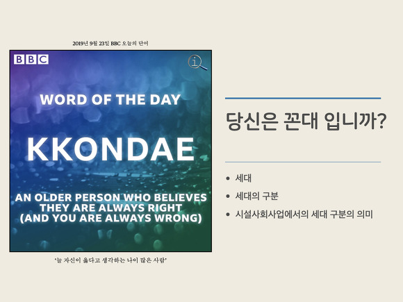 - 영국 언론사 BBC는 2019년 9월 23일 오늘의 단어로 꼰대(KKONDAE)를 소개했습니다. 꼰대를 '늘 자신이 옳다고 생각하는 나이 많은 사람'이라고 설명했습니다.