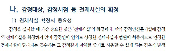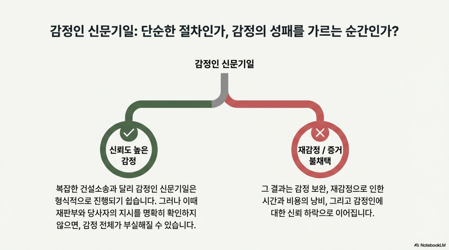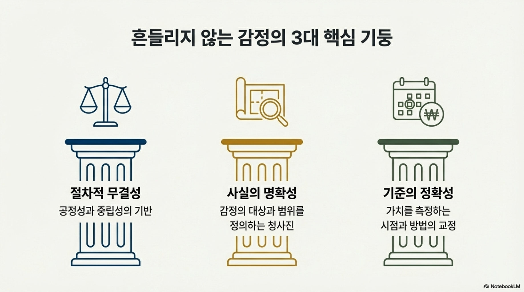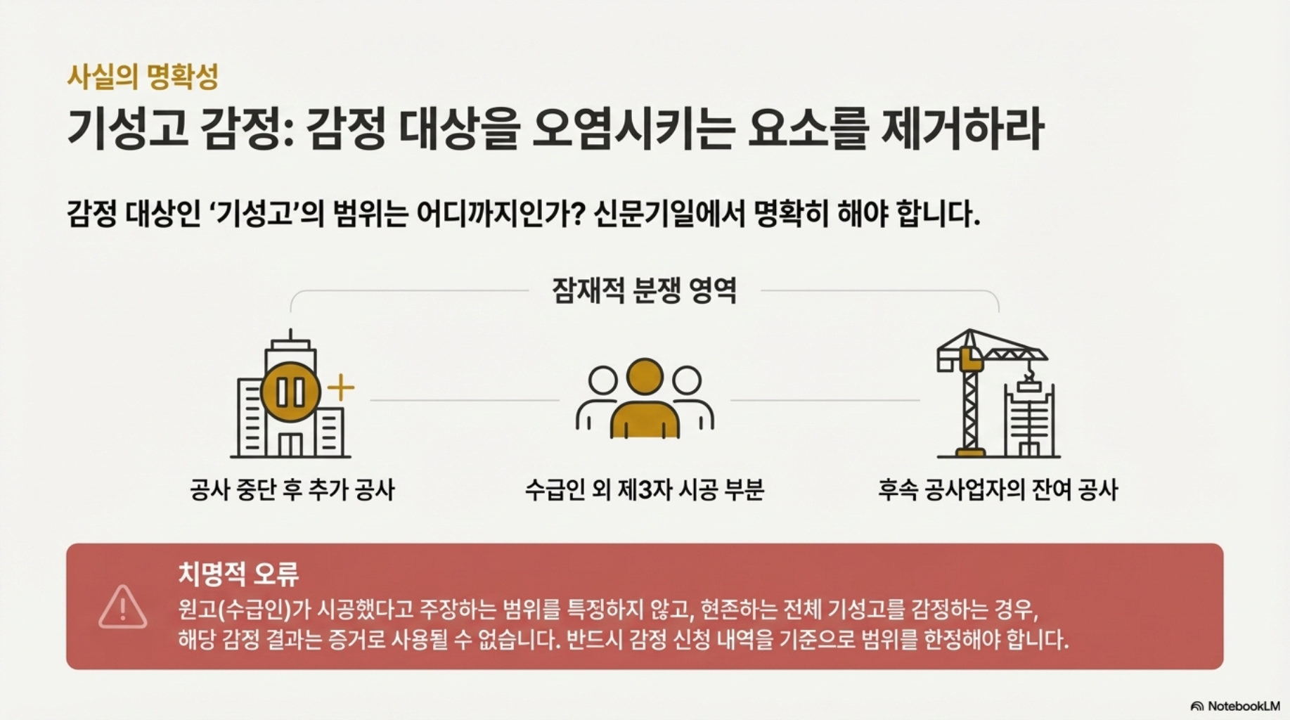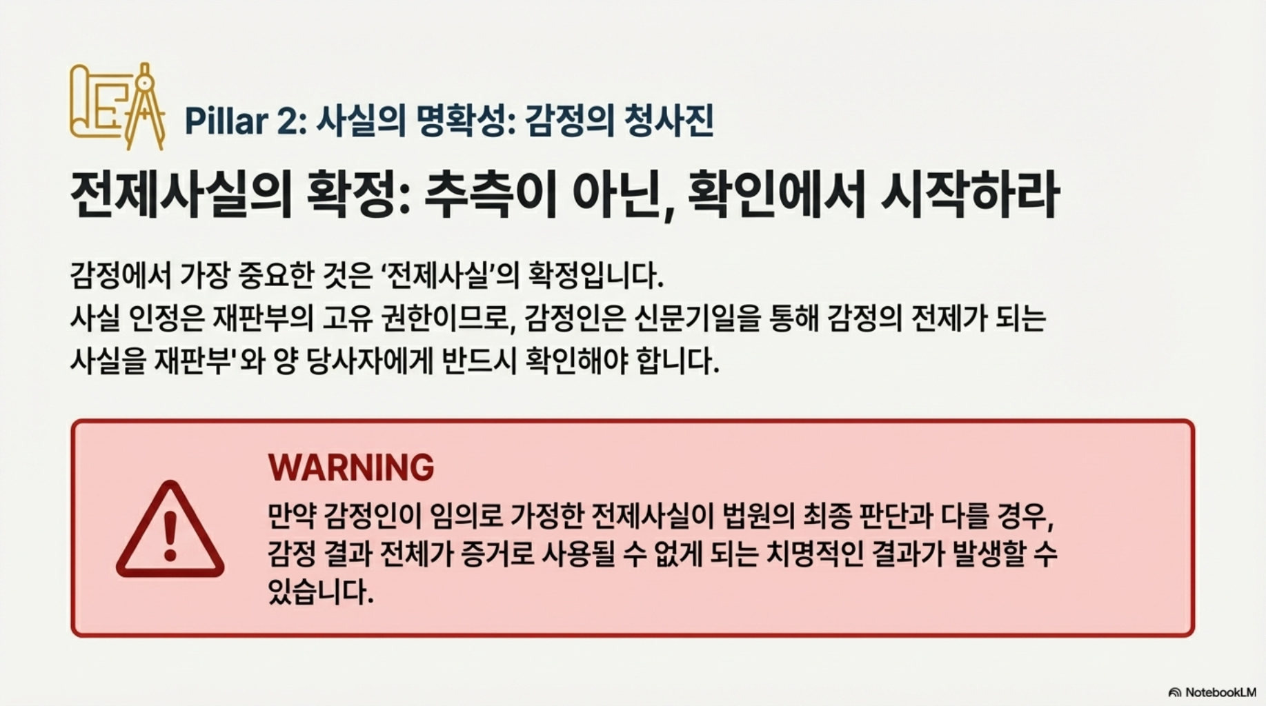 2. 감정의 뼈대: 전제사실의 확정 제가 건축사, 기술사, 법학박사로서 특히 강조하고 싶은 부분입니다. '전제사실'의 확정은 감정의 생명입니다. • 재판부의 권한 존중: 사실인정은 재판부의 전권입니다. 감정인이 임의로 "이건 이럴 것이다"라고 전제하고 감정했는데, 나중에 법원이 다른 사실을 인정해버리면 그 감정 결과는 증거로 못 씁니다. • 신문기일 활용: 그러니 감정인신문기일에 재판부와 당사자에게 감정의 대상과 범위를 확실히 물어보고 확인받으십시오. 그리고 그 확인된 내용을 감정서에 명확히 기재해야 합니다.
