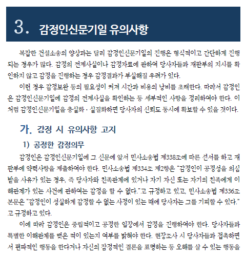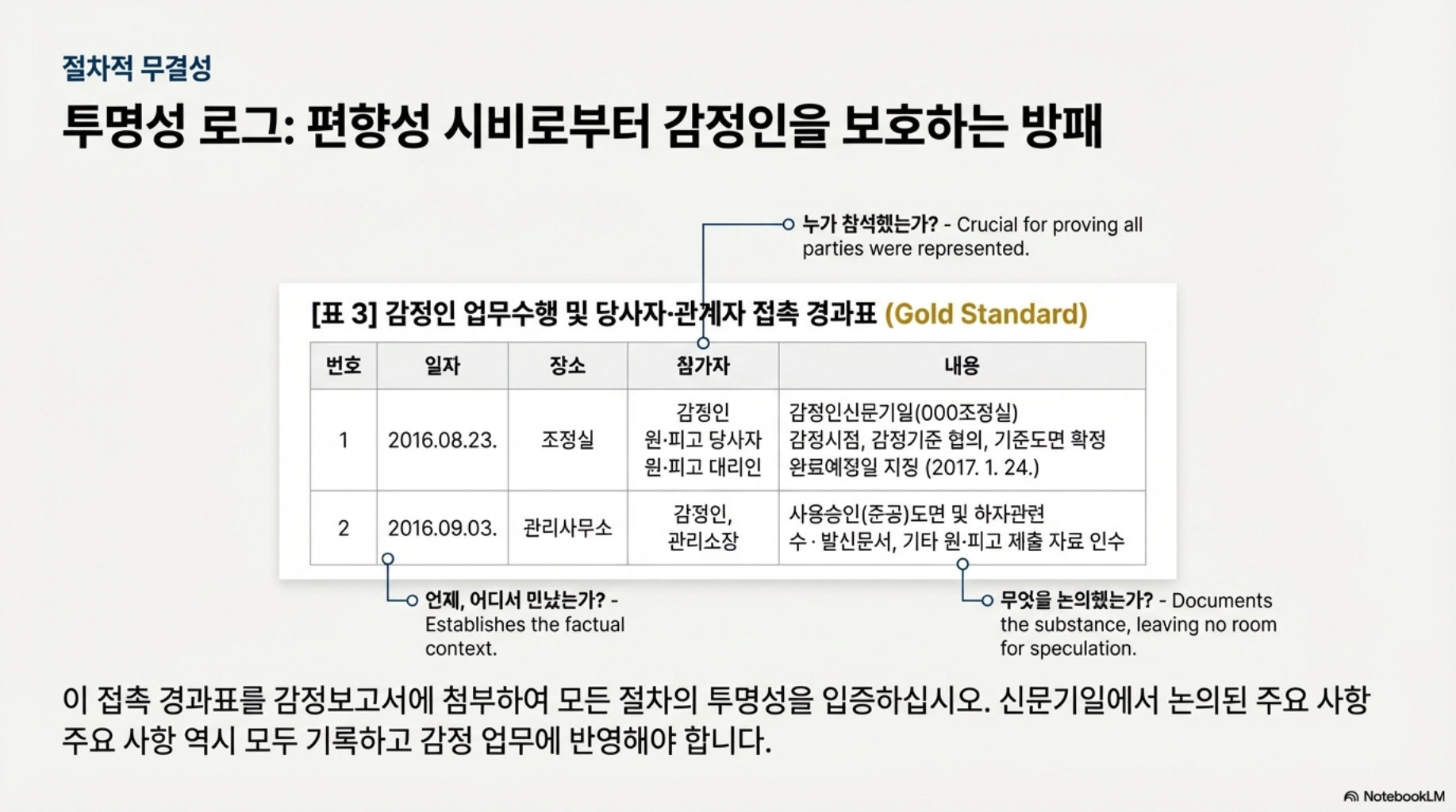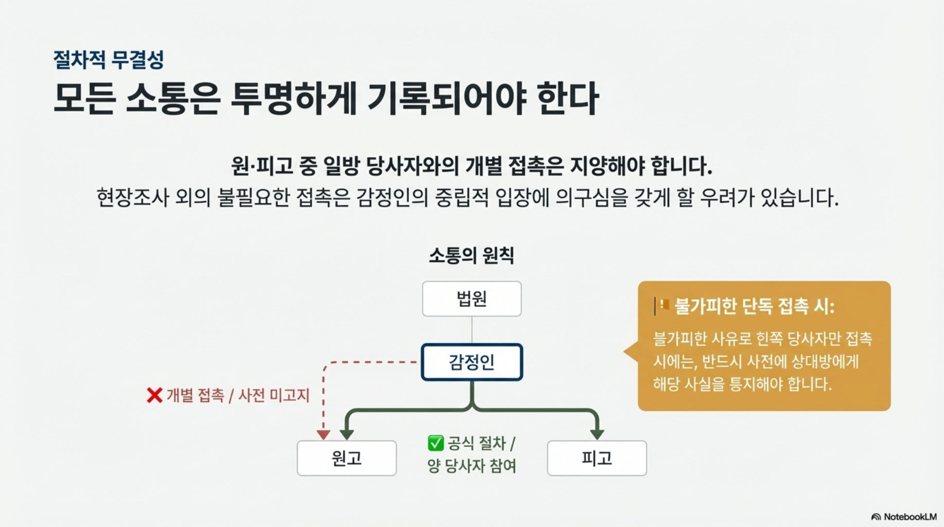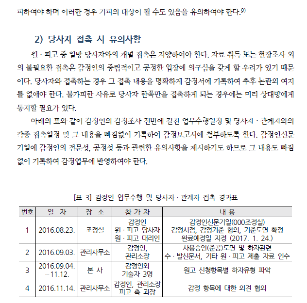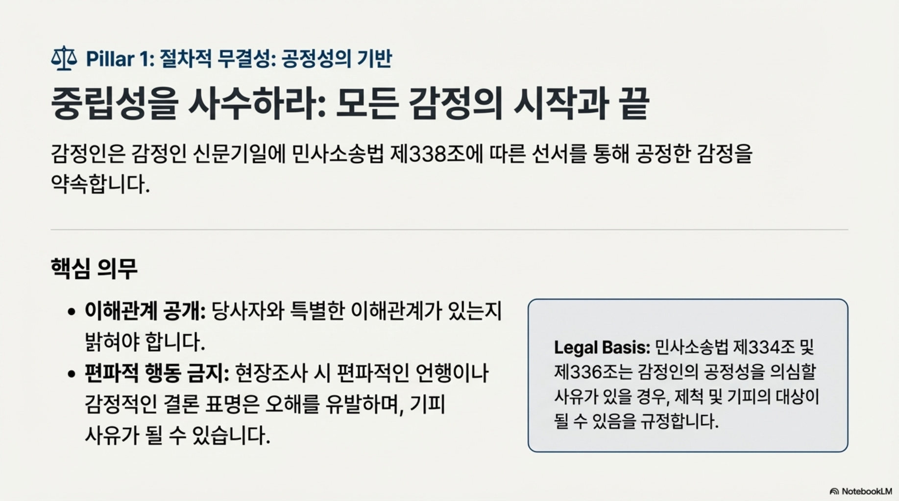 1. 첫 단추: 공정성과 당사자 접촉의 원칙 먼저, 감정인의 기본 자세입니다. 감정인신문기일은 형식적으로 진행되는 경우가 많지만, 이때 감정의 전제사실이나 자료에 대해 명확히 하지 않으면 결과가 부실해집니다. • 중립의 의무: 민사소송법에 따라 우리는 선서를 하고 공정하게 감정해야 합니다. 만약 당사자와 친족 관계거나 이해관계가 있다면 즉시 밝혀야 합니다. • 접촉 금지 및 기록: 현장조사 외에 원·피고 중 한쪽만 따로 만나는 것은 절대 금물입니다. 오해를 사기 딱 좋습니다. 불가피하게 접촉했다면 그 내용을 감정서에 '일자, 장소, 참가자, 대화 내용'까지 표로 만들어 낱낱이 기록해야 합니다. 투명성만이 여러분을 보호해 줍니다.