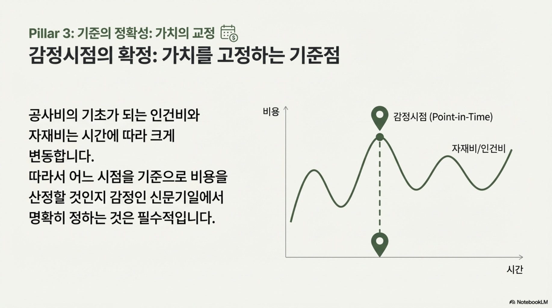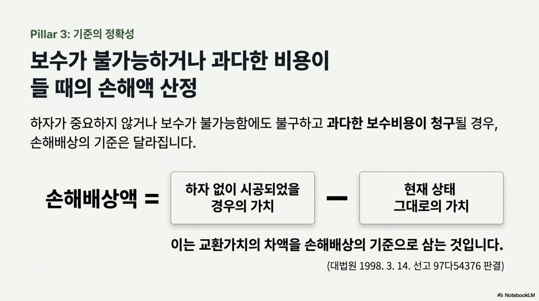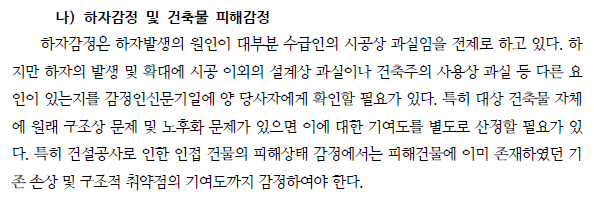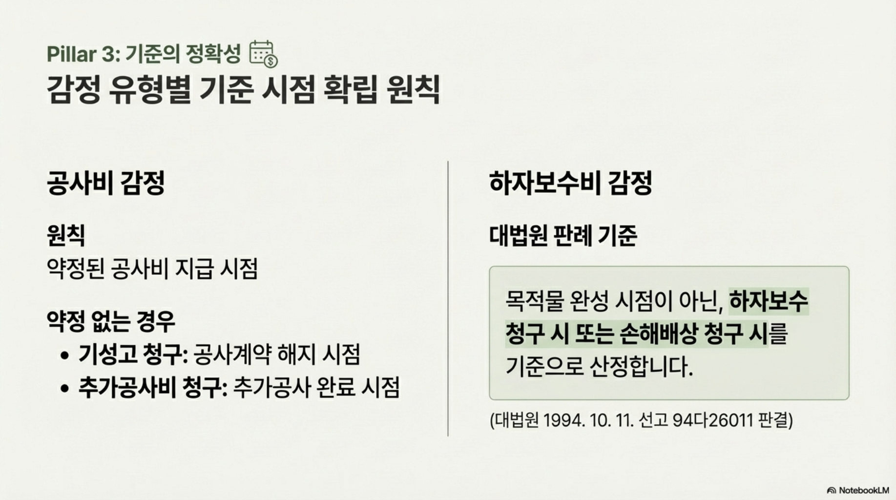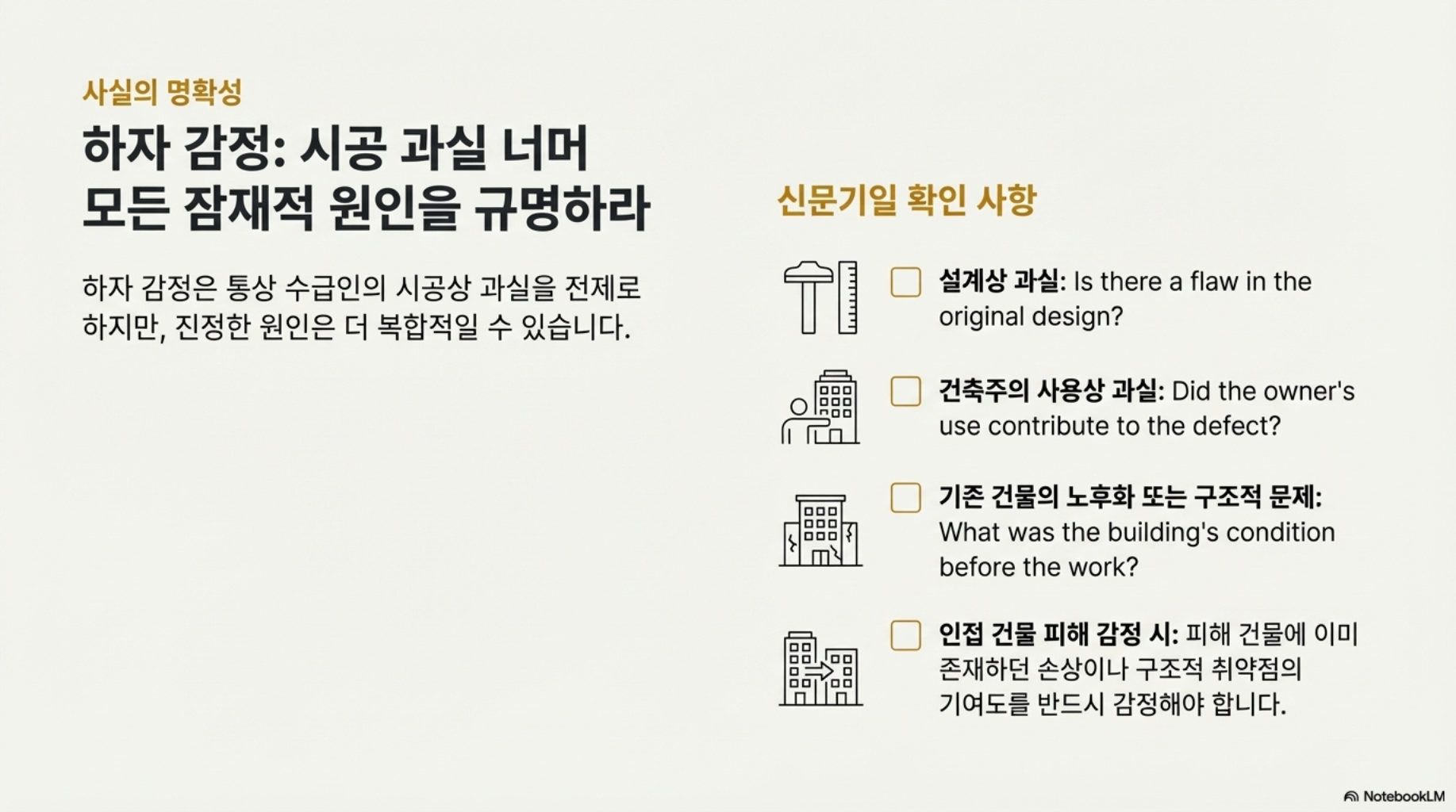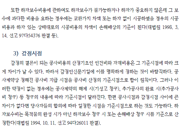 4. 하자 감정 및 기준 시점의 설정 마지막으로 하자 감정과 시점 문제입니다. • 하자의 원인 분석: 무조건 시공사 잘못이라고 단정 짓지 마십시오. 설계상 과실인지, 건축주의 사용상 과실인지, 혹은 건물의 노후화나 원래 구조적 문제 때문인지 신문기일에 확인해야 합니다. 인접 건물 피해 감정 시에는 기존에 있던 균열(기왕증) 인지도 따져봐야 합니다. • 과다 비용의 제한: 하자가 중요하지 않은데 보수비가 너무 많이 든다면? 이때는 '보수비용'이 아니라 '하자가 없는 상태와 있는 상태의 교환가치 차액'이 손해배상의 기준이 됩니다. • 감정 시점: 인건비와 자재비는 시점에 따라 천차만별입니다. 원칙은 계약상 공사비 지급 시점이지만, 계약 해제 시나 추가 공사 완료 시 등 청구 내용에 따라 달라집니다. 하자보수비는 통상 '하자보수 청구 시' 또는 '손해배상 청구 시'가 기준이 됩니다. 이 기준 시점을 신문기일에 명확히 정하고 넘어가십시오.