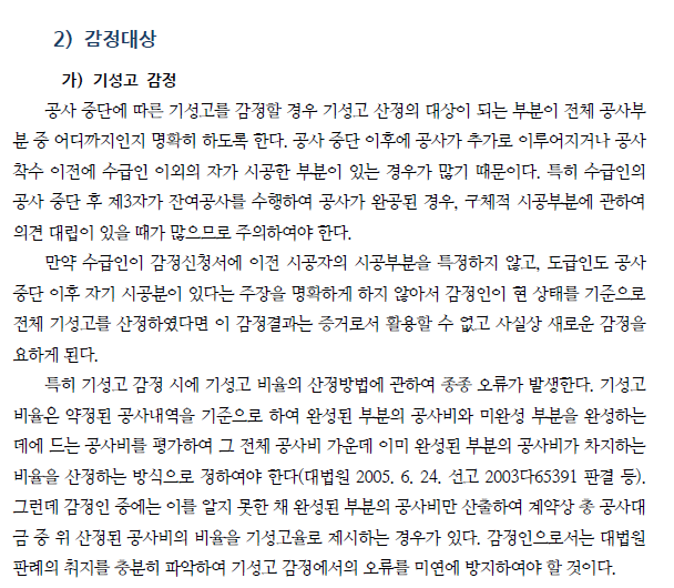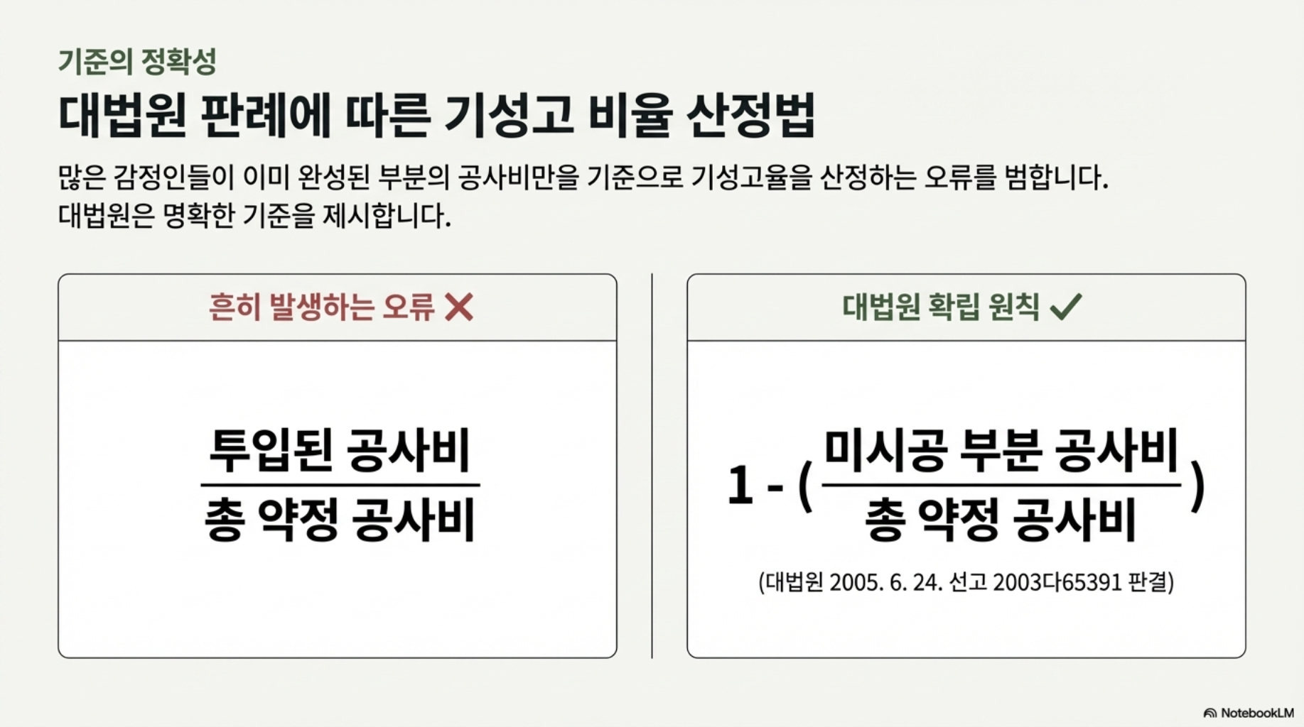 3. 기성고 감정: 초보자가 가장 많이 범하는 오류 건설 현장 출신으로서 말씀드리면, 공사가 중단된 현장의 기성고(공사 진척도) 감정에서 초보들이 치명적인 실수를 자주 합니다. • 시공 주체의 구분: 공사가 중단되고 제3자가 들어와 완공한 경우, 어디까지가 전 수급인의 공사이고 어디부터가 후속 공사인지 명확히 구분해야 합니다. 이걸 섞어서 전체를 기준으로 감정하면, 사실상 처음부터 다시 감정해야 하는 불상사가 생깁니다. • 기성고 비율 산정법(중요): 대법원 판례(2003다65391)를 꼭 기억하십시오. 기성고 비율은 단순히 **(완성 부분 공사비) / (계약 총액)**으로 계산하면 안 됩니다. 이는 틀린 방식입니다. ◦ 올바른 공식: (완성 부분 공사비) / (완성 부분 공사비 + 미완성 부분 소요 공사비) 로 계산하여 전체 공사비 중 기여도를 산출해야 합니다. 이 원리를 모르면 기술사 자격이 있어도 법원 감정은 빵점입니다.