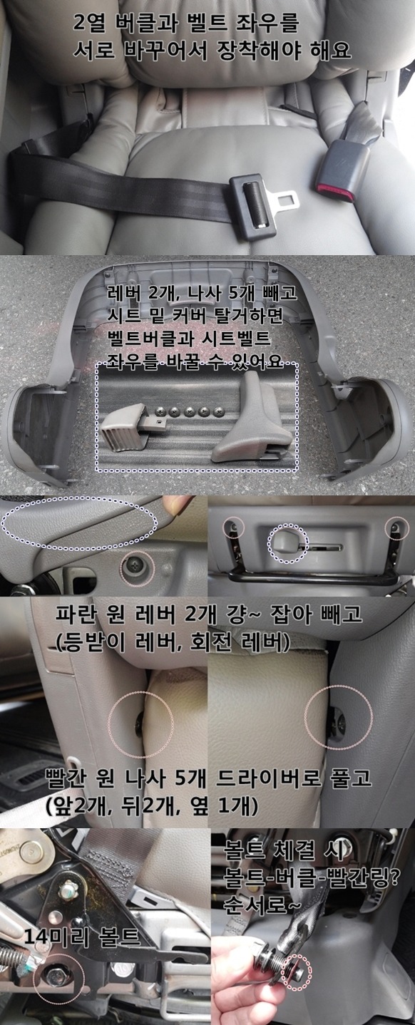 마지막으로 3점식 시트벨트 사용하려면 2열의 기존 2점식 버클 좌우 위치를 맞바꾸어야 합니다.