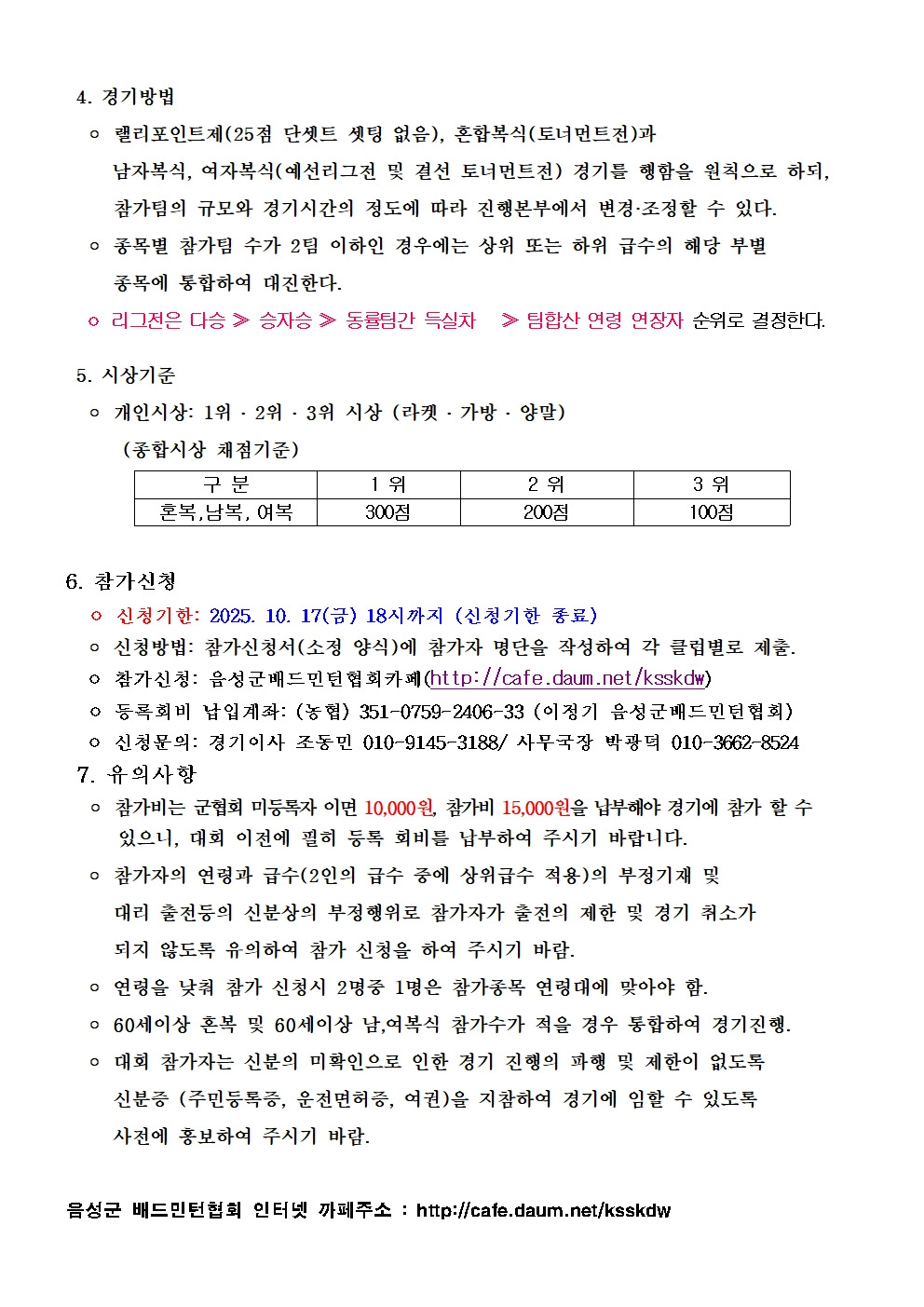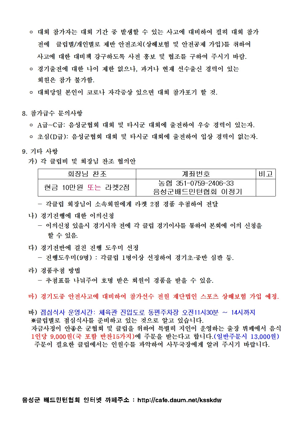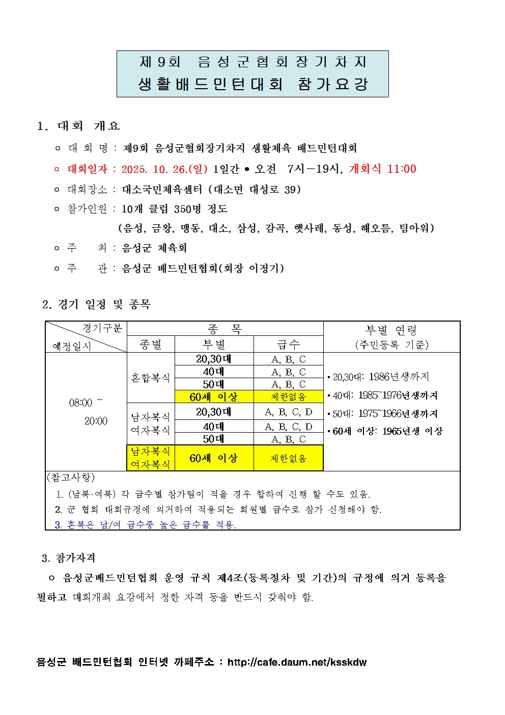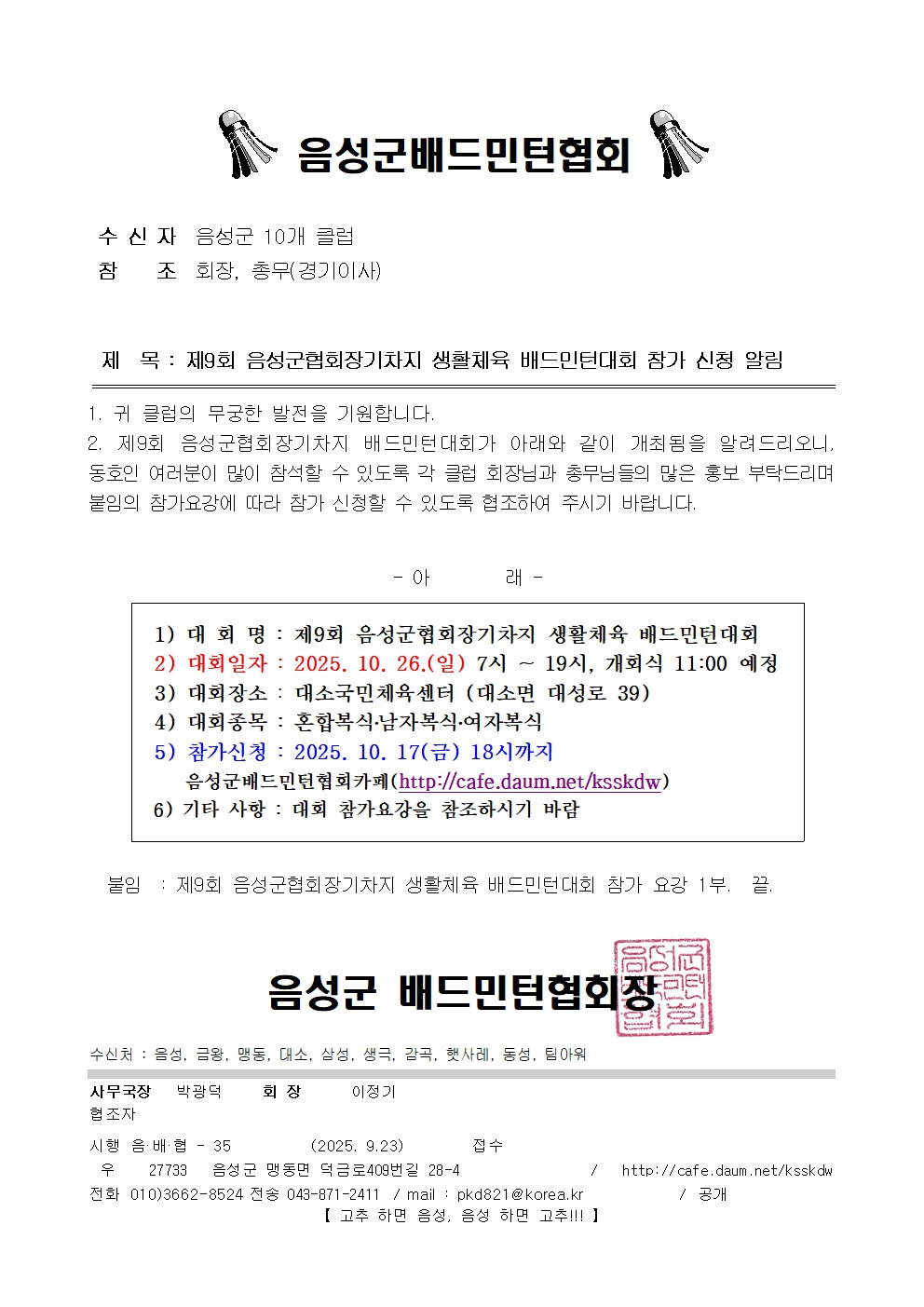 제9회 음성군협회장기대회 참가신청 알림 작성자사무국장 박광덕|작성시간25.09.23|조회수187 목록 댓글 0 글자크기 작게가 글자크기 크게가 참가신청서 양식(2025).xlsx13.73KB 첨부파일첨부된 파일이 5개 있습니다. xlsx 파일 참가신청서 양식(2025).xlsx 다운로드 jpg 파일 제9회 음성군협회장기대회 참가요강001.jpg 다운로드 jpg 파일 제9회 음성군협회장기대회 참가요강004.jpg 다운로드 jpg 파일 제9회 음성군협회장기대회 참가요강003.jpg 다운로드 jpg 파일 제9회 음성군협회장기대회 참가요강002.jpg 다운로드 다음검색 현재 게시글 추가 기능 열기 북마크 공유하기 신고 센터로 신고 댓글 댓글 0 댓글쓰기 답글쓰기 댓글 리스트