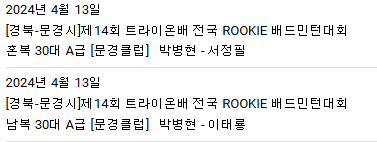 혼복 20D 고정민님 관내 A조, 혼복 20D 박병현님 전국 A조, 여복 20D 서정필님 전국 A조 뛰신 이력 있습니다.