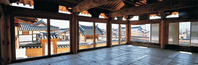 | 경북 의성 사촌마을의 만취당 대청에 앉으면 기둥과 기둥, 창호문과 창호문 사이로 마을의 전경이 한눈에 들어온다. 완연한 봄기운으로 가득한 마을 풍경이 마치 두루마리 그림을 펼쳐놓은 듯하다. 만취당은 ‘보물’이지만, 반들반들한 대청마루에는 누구든 올라앉을 수 있다 |