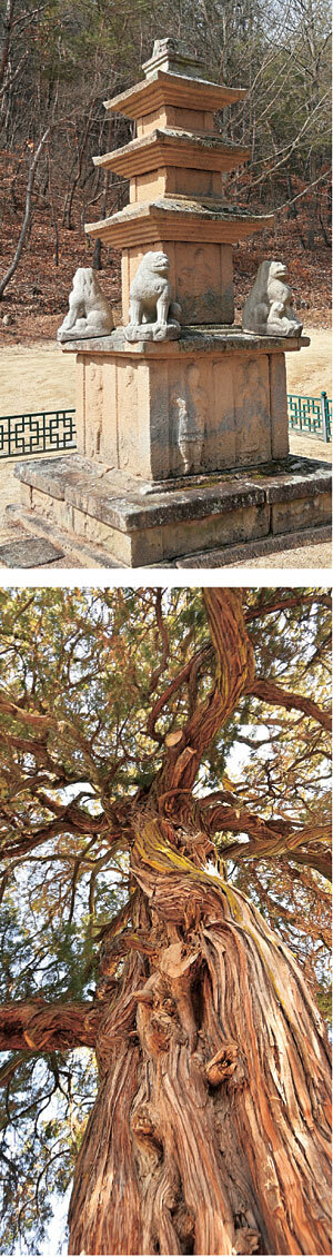 | ▲ 사진 위는 훌륭한 비례감을 갖춘 의성의 빙산사지 오층석탑. 탑에 올려진 사자상은 복제품. 진품 두 개는 일제강점기 도난당했고, 나머지 두 개는 대구박물관에 보관 중이다. 사진 아래는 의성 사촌마을의 만취당 곁에서 가지를 뒤틀며 400년을 자란 아름드리 향나무 노거수다 |