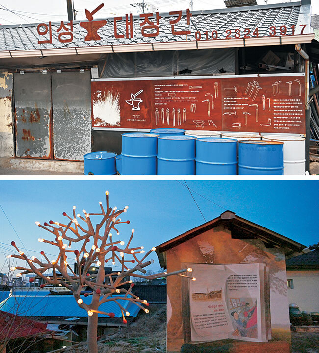 | 의성읍의 문 닫은 성냥공장과 의성전통시장을 잇는 골목에는 마을미술프로젝트로 설치한 미술작품이 곳곳에 있다. 사진 위는 대장간 내력을 적은 인터뷰를 걸어놓은 의성전통시장의 대장간. 사진 아래는 성냥을 형상화해 만든 나무에 불이 들어온 모습. 성냥공장으로 이어지는 주택가 골목에 있다 |