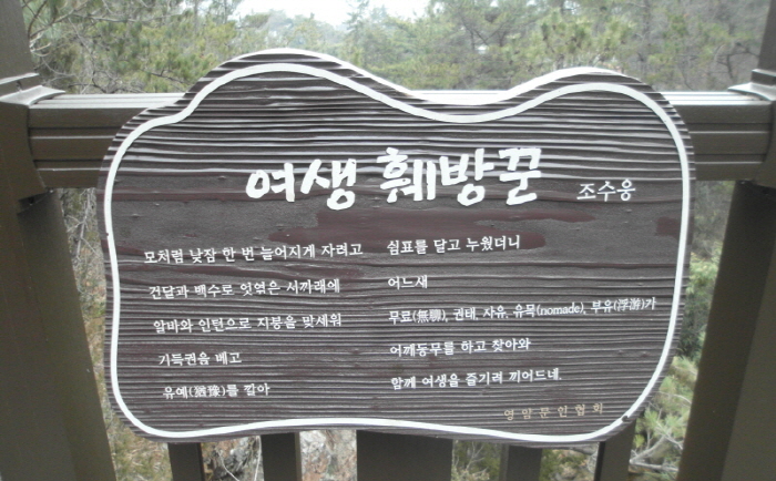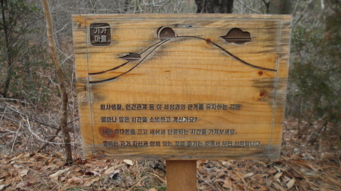 기찬묏길에서 만난 안내문에 새겨진 행복은, "회사생활, 인간관계 등 이 세상과의 관계를 유지한 것이 얼마나 많은 시간을 소비하고 계신가요? 지금 휴대폰을 끄고 세상과 단절되는 시간을 가져 보세요. 행복은 자기 자신과 함께 있는 것을 즐기는 것에서부터 시작됩니다."