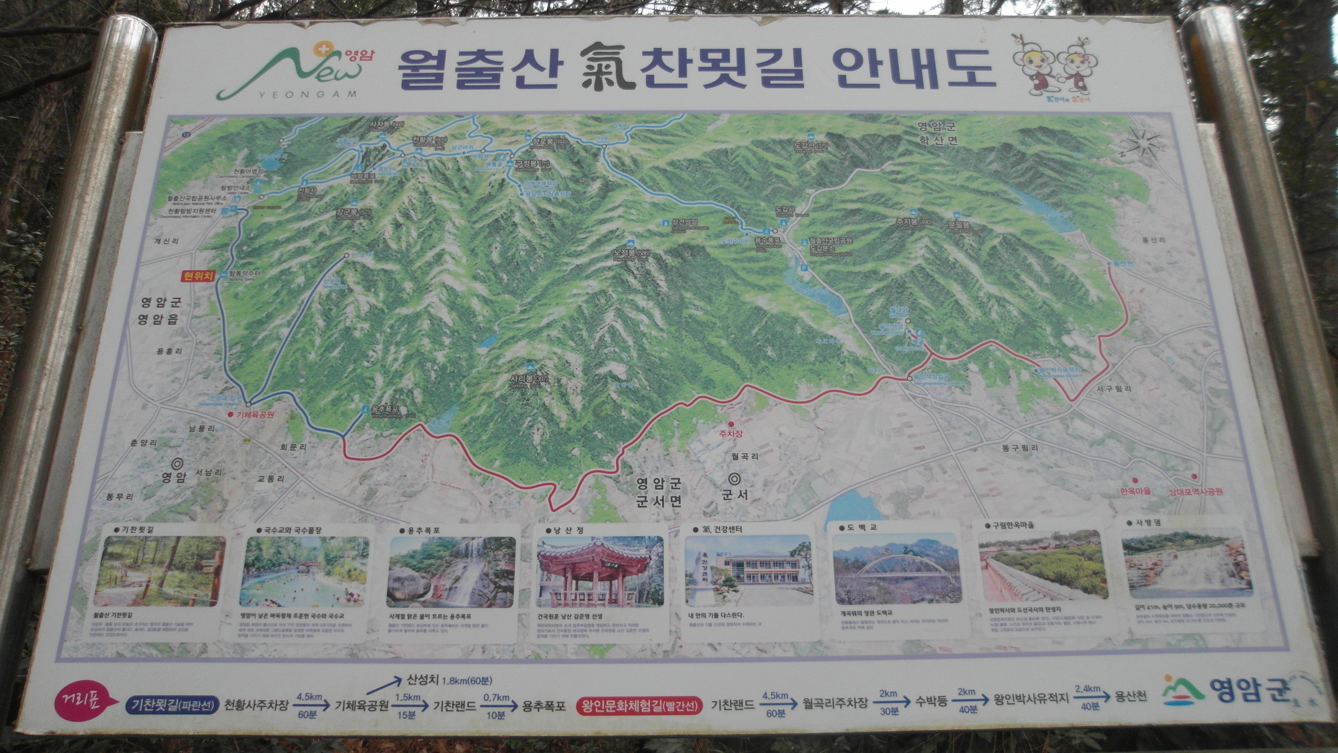 - 왕인문화체험길(빨간선) : 기찬랜드~월곡리 주차장~수박등~왕인박사유적지~용산천 : 10.9km