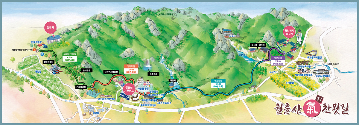 영암군의 걷기여행에는 지상(地上)의 기(氣)를 모아 하늘로 솟구치는 형국의 월출산 기슭을 따라 조성된 '월출산 기찬묏길'이 있다. 월출산의 물, 숲, 바위, 길을 체험하며 피톤치드가 풍부한 숲속에서 월출산의 기를 느낄 수 있도록 개설한 이 길은 2007년부터 조성을 시작했는데 출발지(천황사 주차장)에 세운 안내도를 보면,