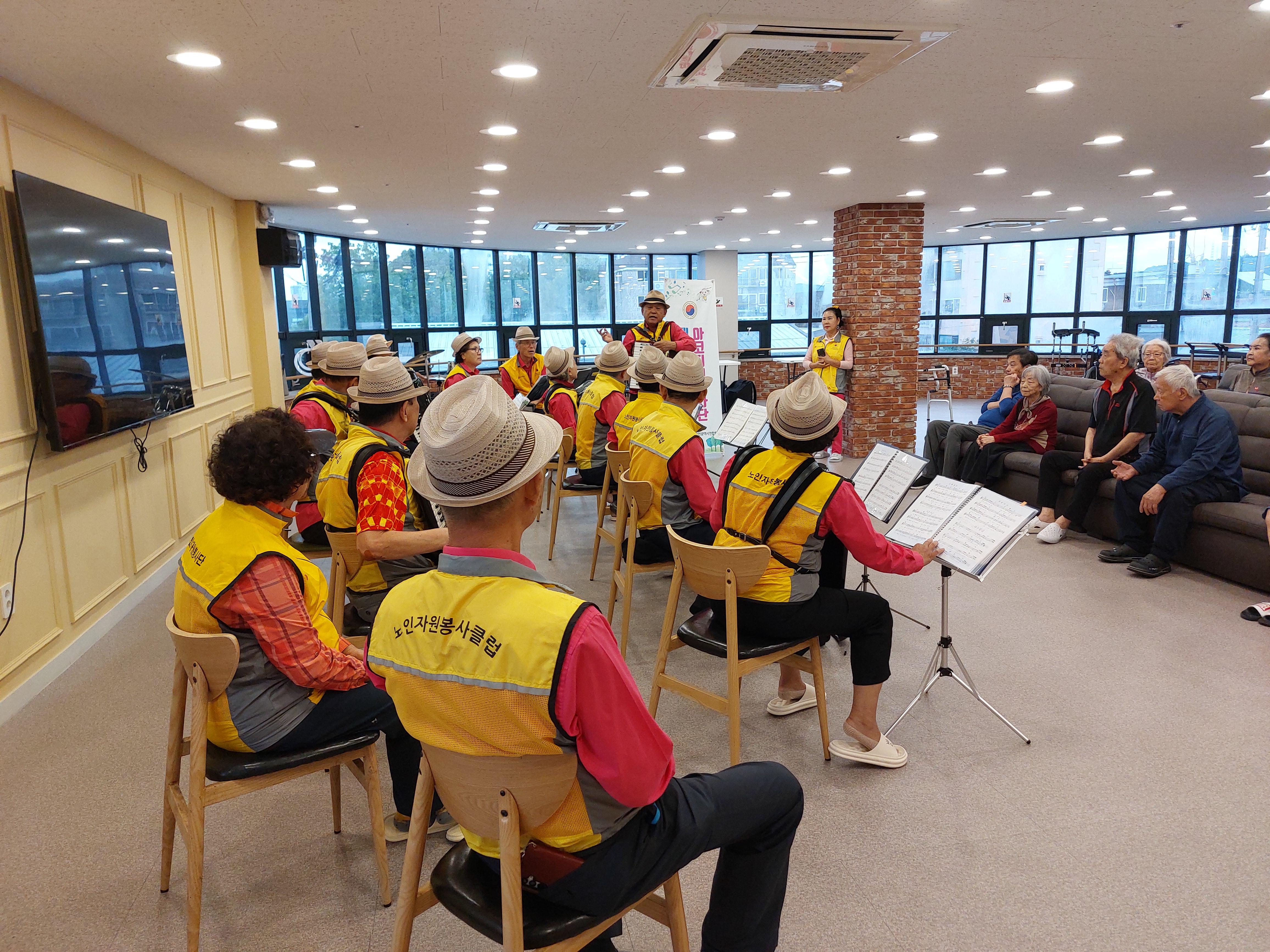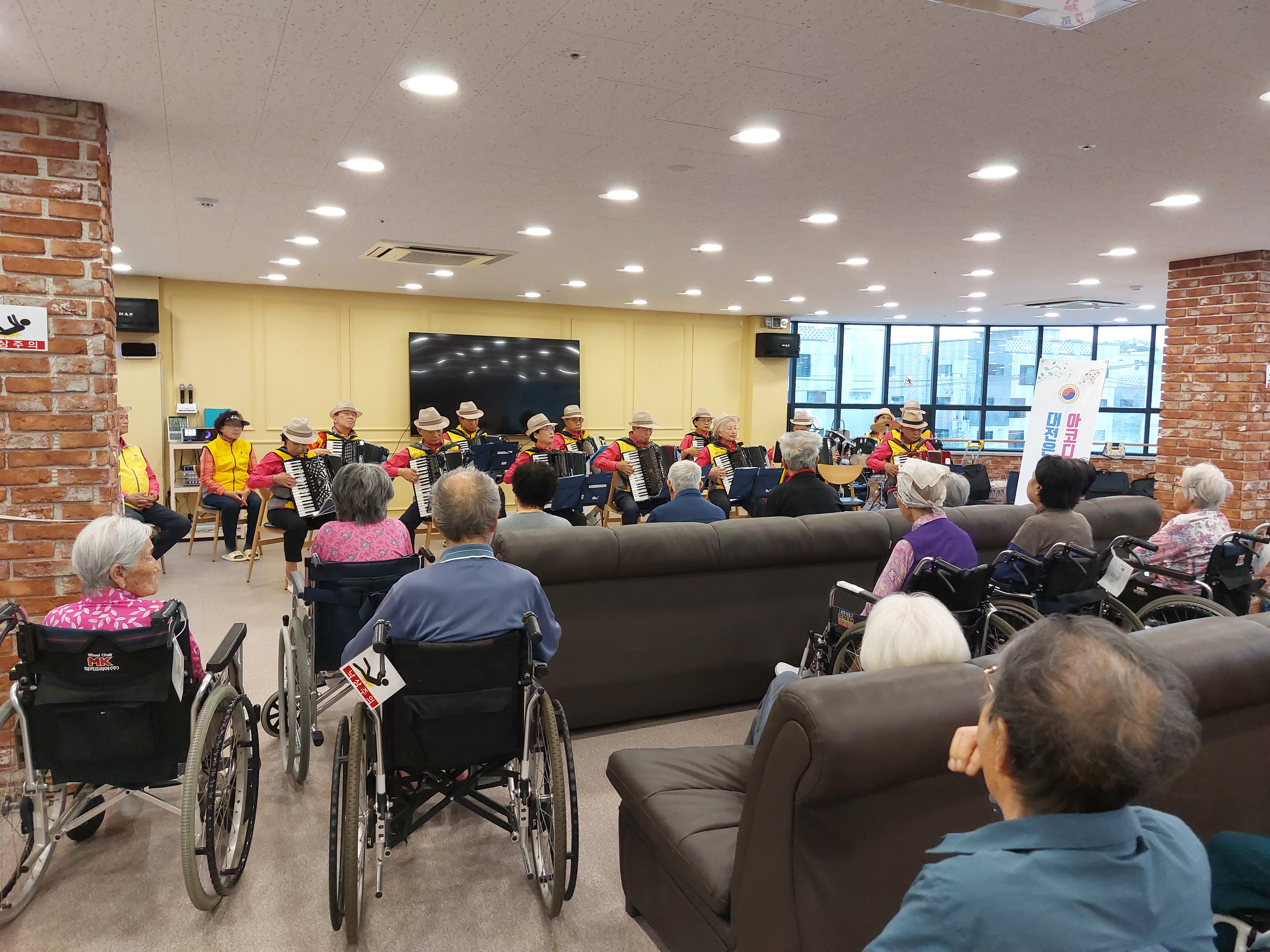 사)대한노인회 대전시연합회 대전은여울아코디언 봉사단(단장 허문행)은 지난 9월 19일 13시30분부터 15시30분까지 예스케어대전요양원 대강당에서 아코디언 동요, 가요를 합주, 중주, 독주 등 공연과 장구 민요 봉사를 실시하였다.