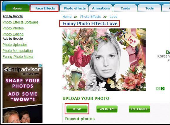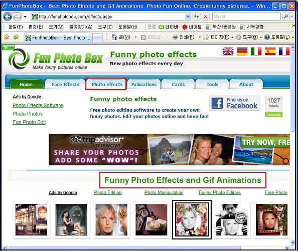 2.웹사이트에서 제공하는 Photo Effect와 Gif Animation 목록이 나타납니다. *목록중에서 다섯번째 Funny photo effect love 사진을 클릭해 봅니다.