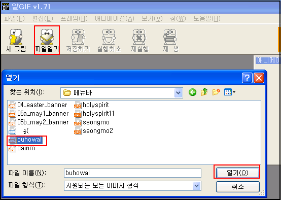 1.알 gif 프로그램 실행 *파일열기-> 그림 저장된 폴더 찾아-> 그림1장 선택-> 열기