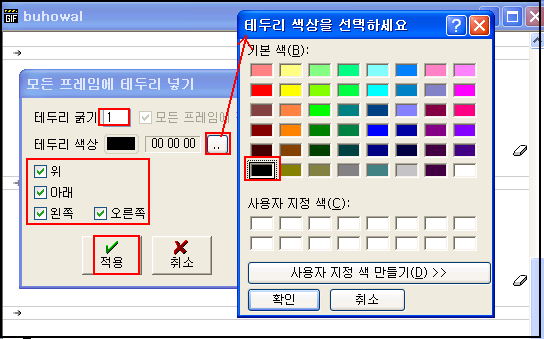 5.테두리 넣기 *메뉴에서-> 플레임-> 테두리 넣기를 클릭하면-> 아래 대화상자에서 *테두리 굵기는 기본갑 : [1} 그대로 하고 색상도 기본값 : 검정으르로 한다. -만약 색상을 변경하고 싶으면-> 색상 팔레드에서 원하는 색상을 선택 *테두리는 위/아래/왼쪽/오른쪽 모두 적용하고-> [적용] 클릭 *그러면 그림외곽에 각각의 테두리가 적용된 것을 확인할 수 있을 것이다.