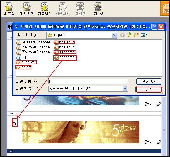 4.같은 방법으로 계속해서 사진을 추가한다. *두번째-세번째-네번째-다섯번째 그림까지 추가가 완료되면-> 취소 단추를 클릭한다.