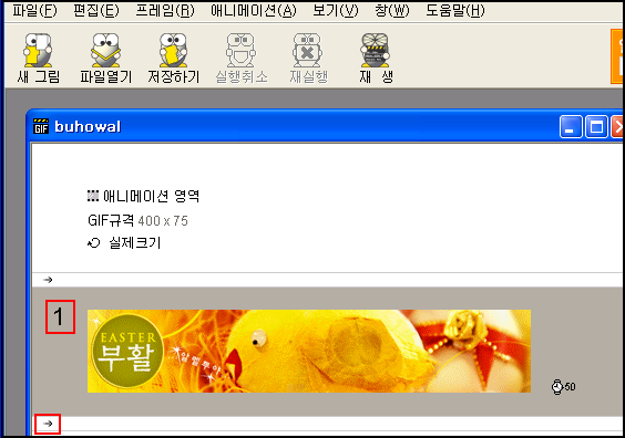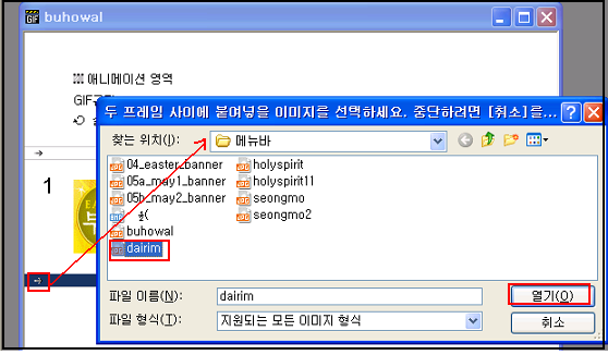 2.첫번째 1번 화면이 등록 되었다. *다음 사진을 추가하기 위해-> 그림아래 화살표[→]를 더블 클릭하여 그림목록 창을 연다.