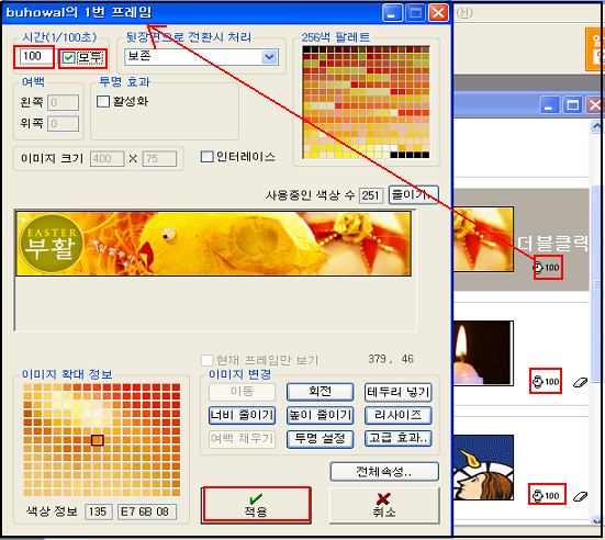 6.지연시간 변경 *오른쪽 애니메이션 창에서 보면 빠르게 진행 되고 있음으로-> 시간을 변경하고자 한다. *스크롤바를 위로 올려-> 1번 그림의 오른쪽-> 시계모양을 선택하고-> 더블클릭 *대화상자에서-> 기본 50을 100으로 변경해 입력하고-> 적용하면-> 5개 그림 모두가 100으로 바뀐다. *오른쪽 애니메이션 미리보기 창에서 보면-> 이전보다 각각의 시간이 지연되어 연동됨을 볼 수 있다.