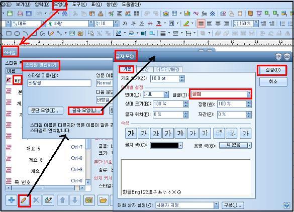 *스타일 대화상자에서-> [스타일 편집하가]아이콘을 클릭하여-> 스타일편집하기 대화상자를 엽니다. *스타일 편집화기 대화상자에서-> [글자모양]을 선택하고-> [글자모양]대화상자에서-> 글꼴을 [굴림] 으로 바꾸고-> [설정]-> [설정]-> [설정]하여 창을 모두 닫습니다.